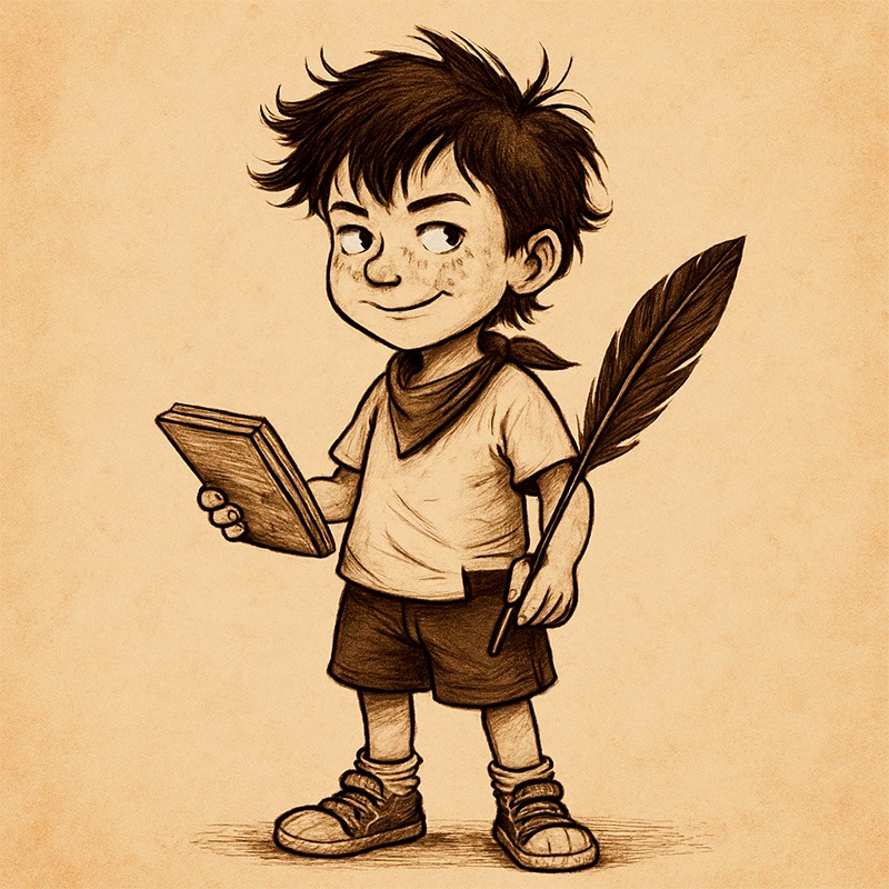 Este último se acerca bastante a mi Billy. ¿Podrías ahora quitarle el gorro, vestirlo con ropa normal de niño (pantalón corto, camiseta, zapatos deportivos, calcetines caídos…) pero manteniendo el pelo enmarañado, la mirada suspicaz, la media sonrisa y, tal vez, la libreta en la mano, la pluma que no escribe bien… ?