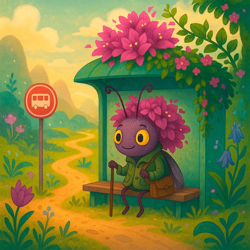…pues eso, como a veces le llamo Bug, un día le pedí a ChatGi que me hiciese un dibujo de él sentado en una parada de autobús. Generó esto: