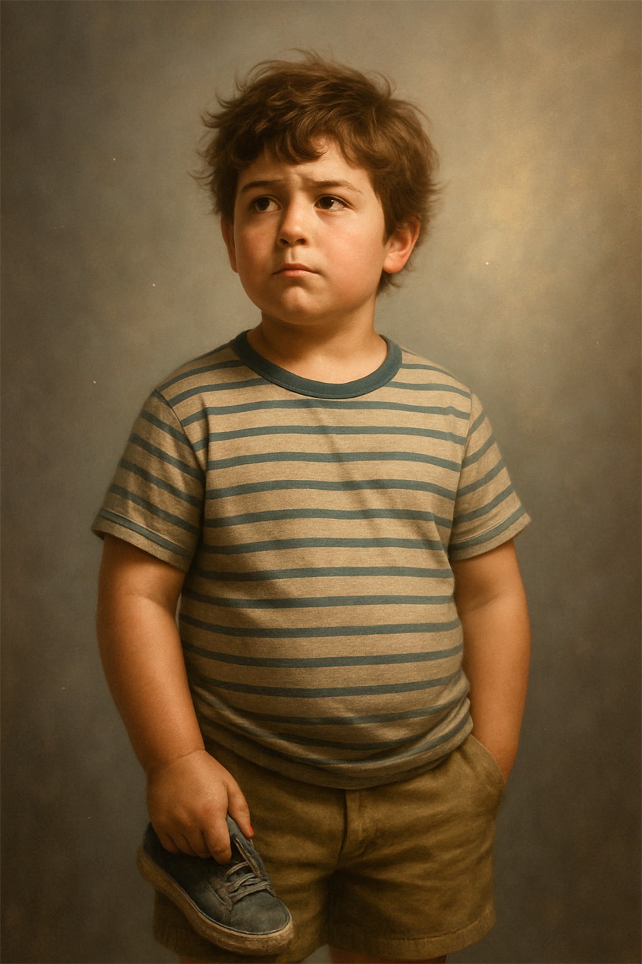 Quiero que esté mirando hacia adelante, como hablando con alguien que no se ve. Unos 12 años, regordete pero sin estar gordo, pelo enmarañado, ojos marrones y ligremente bronceado pero no demasiado. Pantalón corto, camiseta con rayas horizontales finas, calcetines caídos, calzado deportivo cómodo…
