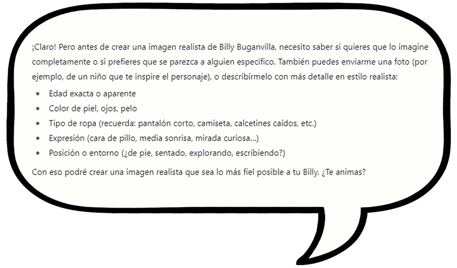 (Me refería al último dibujo; el último de la anterior entrada). A lo que ChatGi me interrogó sobre algunas características específicas que creía necesitar para poder generar una imagen lo más realista y cercana posible a lo que yo tenía en mi cabeza.