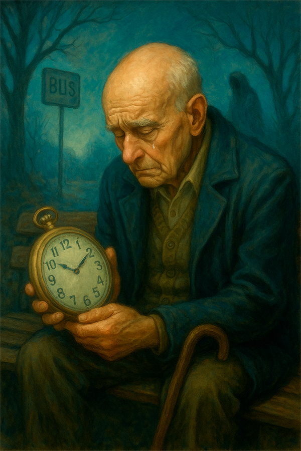 …y el autobús llegó a su parada. El anciano se bajó y se alejó caminando lentamente, arrastrando sus cansados pies por la acera, cabizbajo, como ensoñado, todo brillo de esperanza borrado de sus ojos. 385 años dijo que tenía, y sabía que le quedaban muchos más para poder descansar del todo junto a su amada esposa.