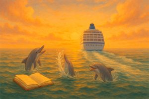 «…me he asomado a la cubierta y, con una puesta de sol inenarrable, acompañado el trasatlántico por una bandada de delfines con sus gráciles y simpáticos saltos,… he vomitado.»